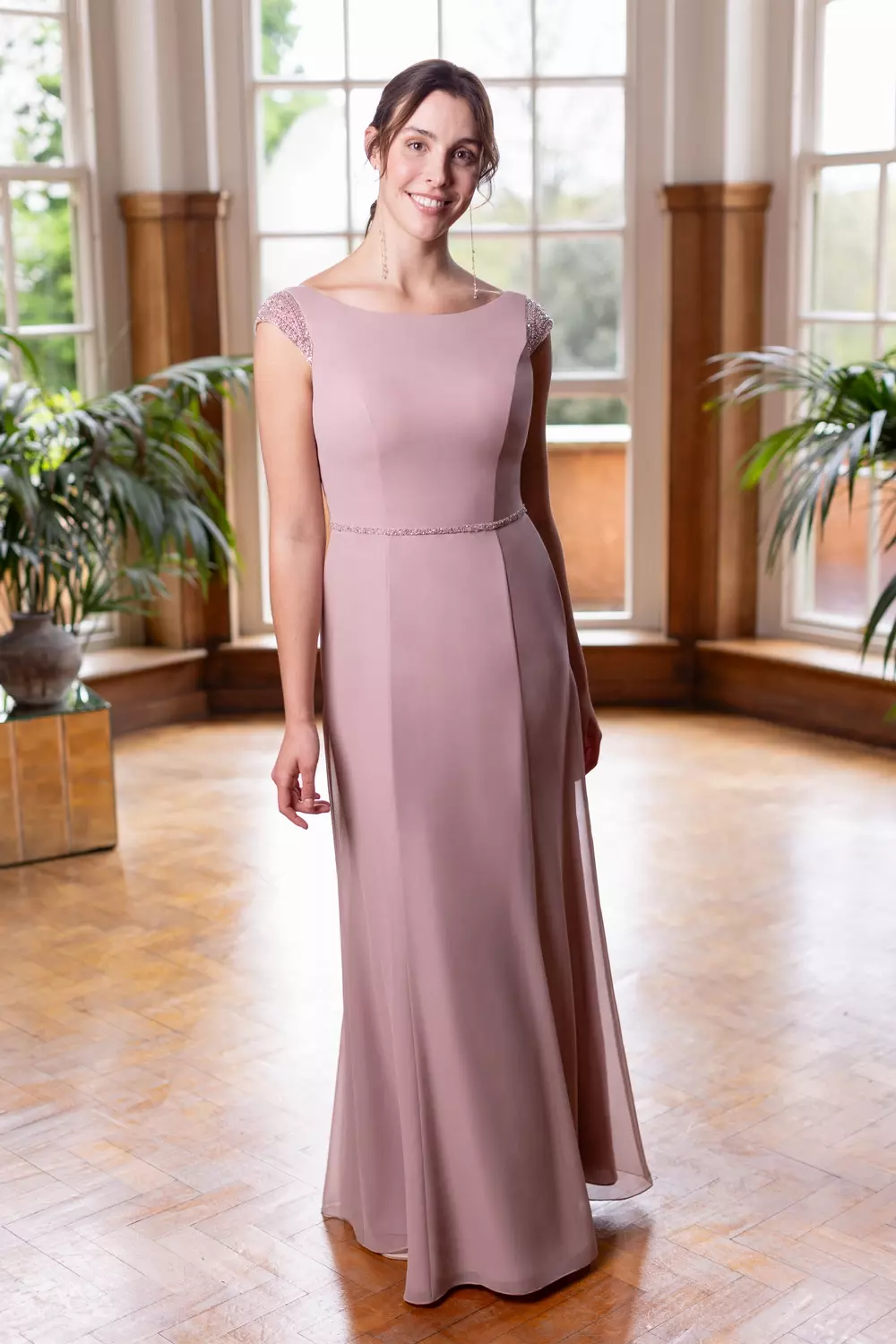 New to True Bridesmaids, this A-line slim fit dress features glamorous embellished capped sleeves with matching belt to flatter your figure. A plunging low back line and elegant button trim hugs the figure to create a stunning silhouette. This dress has a simple zip closing. Looking to dress the whole bridal party? This style has a matching teen and flower girl dresses at C743 & T743. Pictured with bridal gown Seville W420 and bridesmaid styles Nellie E245, Amelia C & Blossom M482CR.
