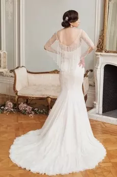 This stunning vintage-inspired bridal gown is a WOW-dress, encrusted head to toe in crystals and tiny pearls. The softest of tulle we could find is delicately hand-beaded and laid upon a French style Overlace. Both fabrics are laid over a lightweight Satin and worked into a subtle mermaid silhouette with train. This dress reminds us of the beauty of the Gatsby era with its deep plunge neckline and sheer sleeves. Every bride needs a aisle-worthy back like this waterfall-style beaded cape back. The dress is finished with a zip fastening and button trim.