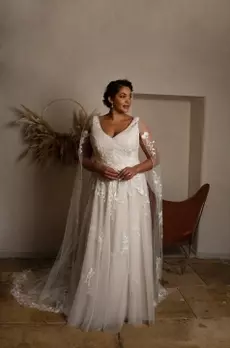 Crafted around a classic, figure enhancing silhouette complete with our full luxury curve construction, Rhodes TC-W442 lets the lace and embellishment fully do the talking. With a cascade from head to toe of art nouveau inspired floral lace, the craftsmanship and intricacy in the detailing adds to the allure of this one of a kind gown. Completed with a full length detachable cape, delicately finished at the hemline with an edge of intertwining floral lace appliqués, creating an aisle entrance guaranteed to wow. Easily removable from the shoulder, this gown takes you from vows to dancing the night away all in one look!