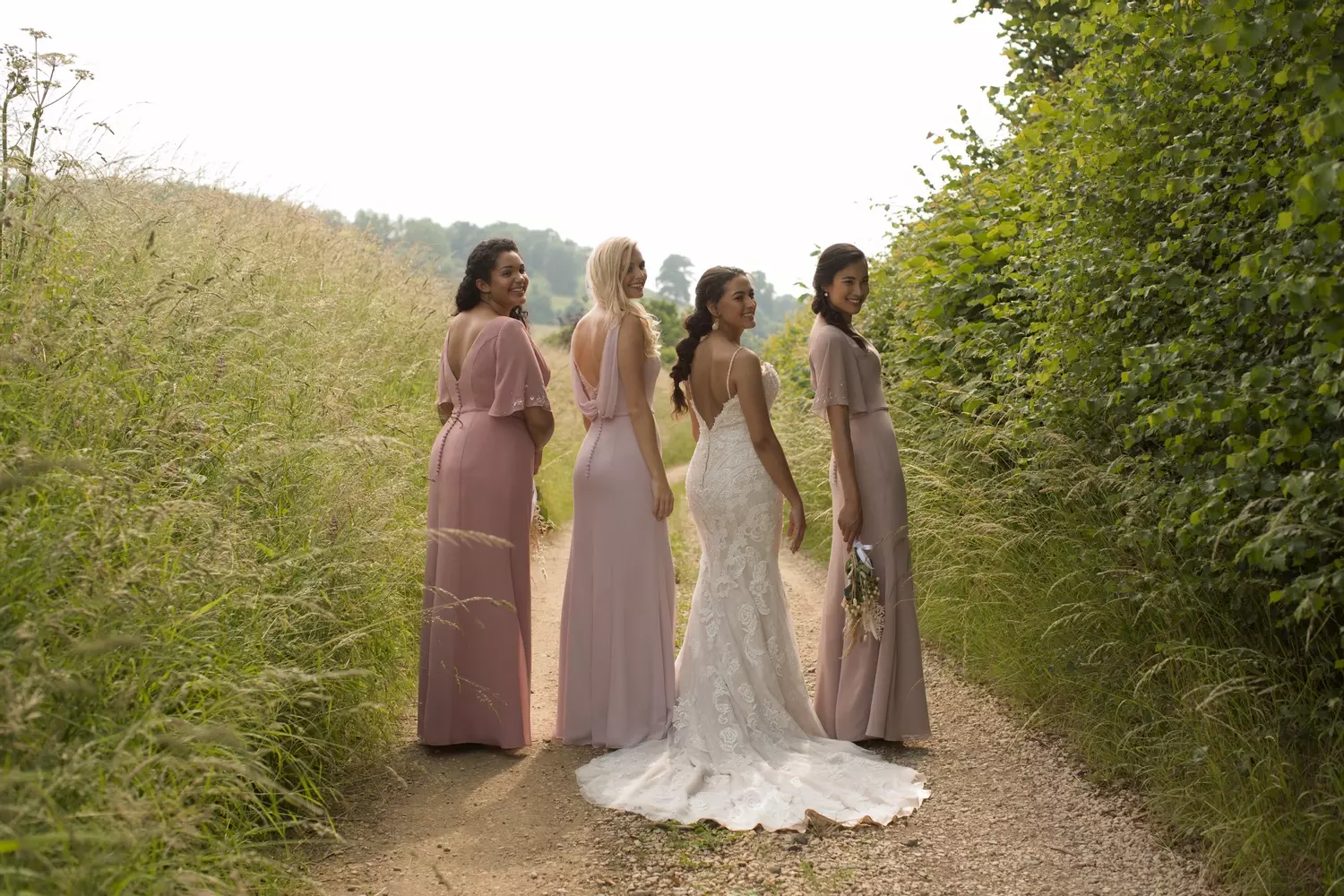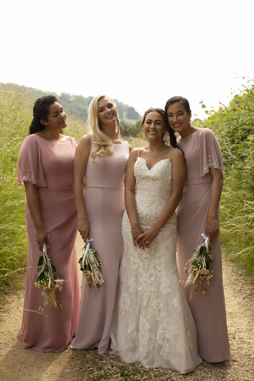 This glamorous bridesmaid style features an elegant boat front neckline that’s contrasted with a deep plunge back with cowl drape, complete with an eye-catching ‘illusion’ insert with hand beaded detailing. A simple chiffon belt clinches the waist which leads to our signature slim skirt silhouette with a centre back split for a modern look. Also available in crepe at M481CR. Pictured alongside Bridal style Anna W330 and Bridesmaids style Blossom M482C.