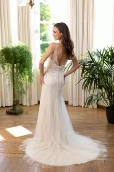 Seville is True Bride’s modern take on vintage bridal glamour. This elegant fit and flare silhouette is adorned with delicate floral inspired hand beaded across the bodice and skirt to enhance the figure flattering effect. The classic V neckline is contrasted by a low V at the back, adding to the wow factor of this style. Pictured with bridesmaid styles Nellie E245, Amelia C, Farrah M743 & Blossom M482CR.
