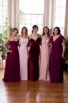 This style is a modern & elegant bridesmaid dress. Featuring a deep scoop front neckline and a fabulous V-back neckline - it really has that wow factor. Hand dyed lace has been carefully placed on the bodice and skirt to create a figure flattering look and a narrow belt cinches the waist. It has our slim fit and flare panelled skirt which gives this style a timeless silhouette. Available in both crepe & chiffon (Amaryllis C).