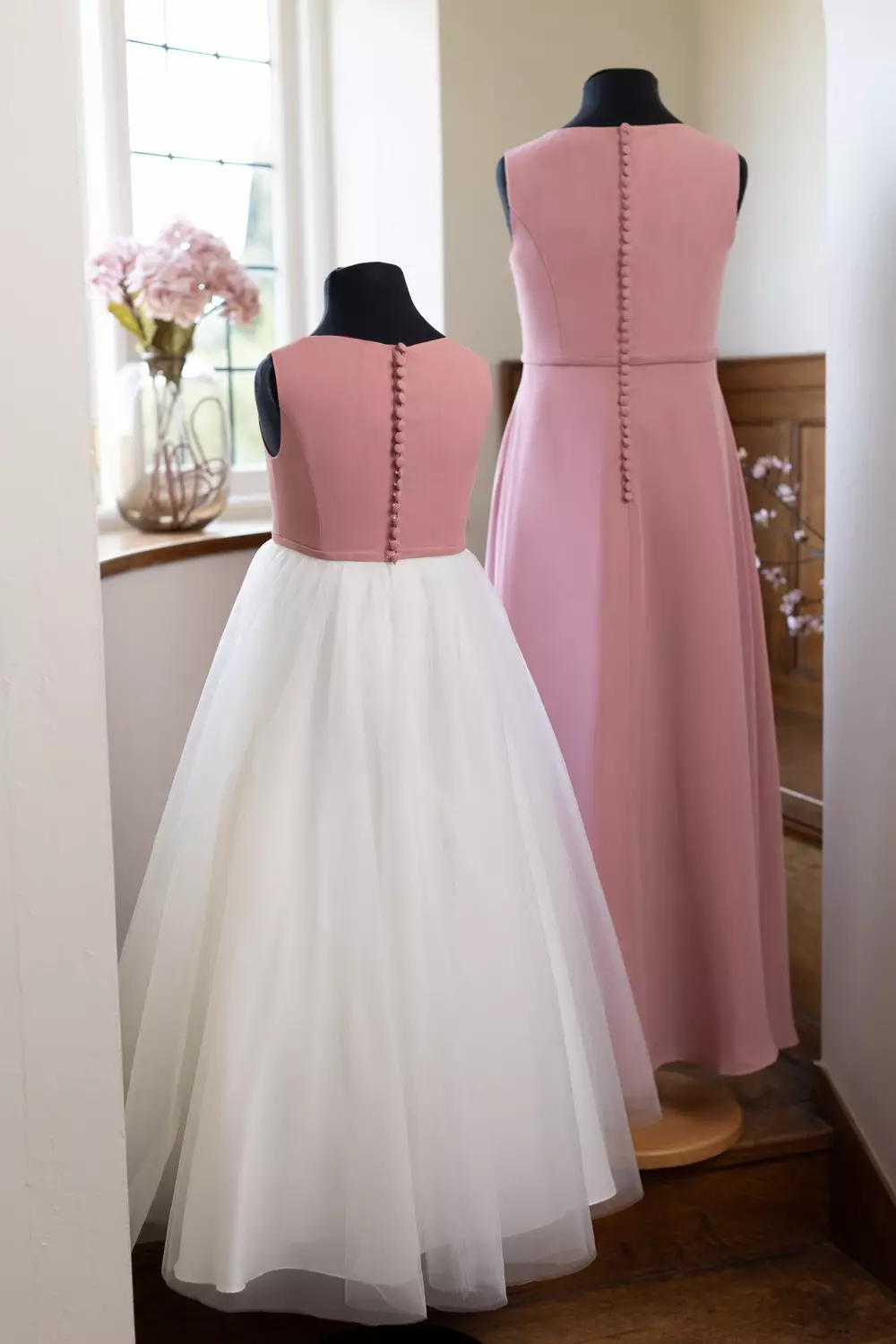 T205 C (right) is our matching teenage style. Featuring a soft round neckline, chiffon bodice with pleated detailing to the waist. Finished with a narrow belt, a slim chiffon skirt and zip up back finished with buttons. Also available in charmeuse as T205 CHAM.
